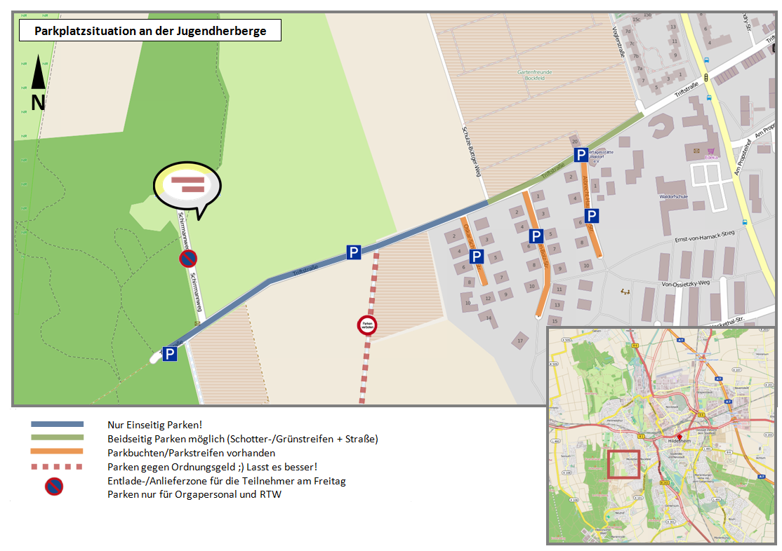 Da am Eventort keine speziellen Parkflächen vorgesehen sind, appellieren wir an eure Vernunft und bitten euch eure Fortbewegungsmittel nach den Regelungen der StVO im Umkreis des Eventgeländes abzustellen. Bitte stets dafür sorgen, dass Feuerwehr und Co zur Jugendherberge hin und auch weg können! Für die Teilnehmer der Meisterschaft wird es bei Anreise die Möglichkeit geben direkt vorzufahren und ihre Sachen auszuladen.