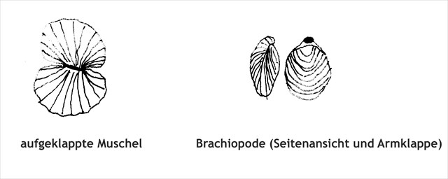 Während die Muscheln klappensymmetrisch sind und man zwischen linker und rechter Klappe unterscheidet, sind die Klappen bei Brachiopoden nicht gleichgroß und es wird zwischen Stiel- und Armklappe unterschieden, wobei die Stielklappe ein Loch besitzt durch das bei rezenten Exemplaren ein muskelartiger Stiel ragt. Weiterhin leben Brachiopoden ausschließlich marin, aber bei den Muscheln gibt es auch Süsswasserexemplare. Alle Brachiopoden erzeugen einen Wasserstrom und filtern das Meerwasser nach Plankton und organischen Resten. Auch bei den Muscheln ist diese Lebensweise sehr verbreitet, aber es gibt auch viele Muscheln die eine andere Lebensweise pflegen (z.B. Sedimentfresser). Gerade für Fossilfunde ist der Aufbau des Öffnungsapperats der Gruppen wichtig. Muscheln schließen ihr Gehäuse aktiv mit den Schließmuskeln und öffnen es ohne Kraftaufwand durch ein elastisches Band am Schloß - das Ligament. Nach dem Tod einer Muschel erschlafft der Schließmuskel und die Klappen öffnen sich. Nur wenn die Muschel in Lebendstellung oder zumindest nahe an ihrem Lebensort eingebettet finden sich vollständige Gehäuse. Werden sie nach dem Tod umgelagert findet man nur noch Einzelklappen. Bei den Brachiopoden erfolgt sowohl das Öffnen als auch das Schließen der Klappen durch aktiven Muskelzug, deshalb bleiben die Gehäuseklappen nach dem Tod geschlossen. Isolierte Brachiopodenklappen sind immer ein Hinweis auf weite Transportwege.