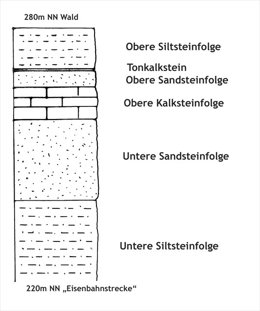 Untere Siltsteinfolge: 20 m grober Sandstein und graubrauner sandiger Tonstein sowie brauner mulmig verwitternder Siltstein mit z. T. lagenweise angereicherten Fossilien.