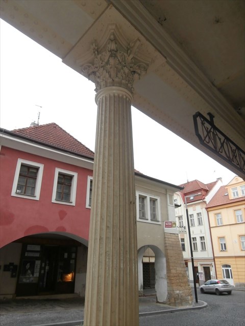 Budova okresního hejtmanství s průčelím do náměstí. V tomto bloku bylo v č.p. 37-38/1 Novotného knihkupectví, které si v roce 1891 koupil V. Klement a v něm vedle knížek a papírnického zboží „načerno“ prodával i součástky k jízdním kolům.