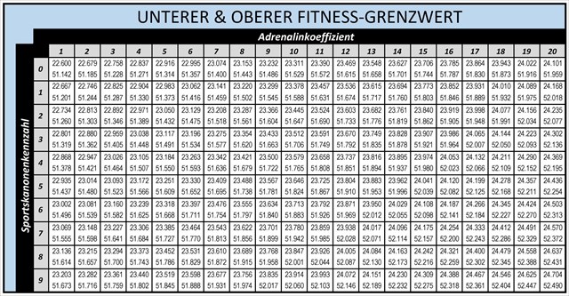 So, deine aktuelle Fitness, resp. der untere und obere Grenzwert davon, lässt sich nun ganz simpel aus der folgenden Tabelle herauslesen. Je nach körperlicher Verfassung kannst du dir überlegen ob du noch etwas trainieren willst, oder gleich los legst und die erste Disziplin in Angriff nimmst.