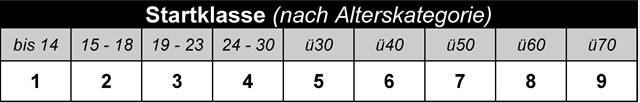 Zuerst solltest du also wissen in welcher Kategorie du antreten wirst. Dazu wählst du in der folgenden Tabelle deine Alterskategorie und erhälst somit die entsprechende Startklasse. Merke dir diese!