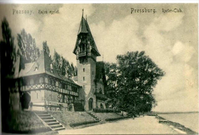 Na petržalskom brehu Dunaja sa až do roku 1968 vypínala jedinečná novogotická stavba s vysokou vežou. Bol to Bratislavský veslársky klub (B) (Pozsonyi hajós egylet - PHE), ktorý sa po vzore anglických veslárskych klubov stal v roku 1862 prvým moderným športovým klubom v Uhorsku. Stavba projektovaná vtedajším známym architektom Raimundom Jeblingerom bola v štýle romantického zámočku. Okrem rozličných veslárskych pretekov usporadúval aj ľahkoatletické súťaže na blízkom ihrisku, ktoré už rovnako nestojí. Pri výstavbe mosta vodácky areál asanovali. Ochranári pamiatok rešpektovali jeho architektonickú hodnotu a jednotlivé očíslované prvky starostlivo poodvážali a uskladnili v hospodárskom dvore bývalého JRD Rusovce. Tým sa však aj starostlivosť o ne skončila. V nasledujúcich rokoch pri náhlivej likvidácii roľníckych družstiev sa celé drevené steny a stavebné prvky rozkradli. Zachoval sa iba pietny reliéf na pamiatku členov klubu padlých v prvej svetovej vojne.