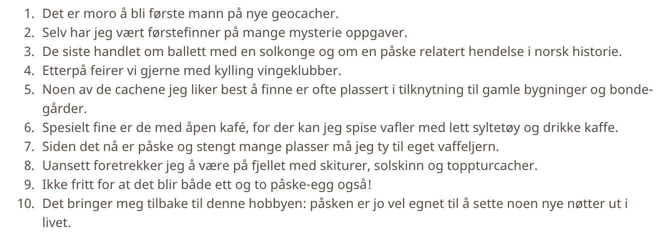 Vurdér om følgende setninger har orddelingsfeil (eventuelt særskrivingsfeil) eller ikke. Sett 0 for feil og 1 for riktig.