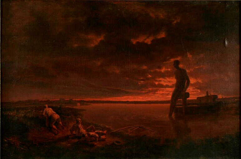Voici la légende du tableau : Au crépuscule, au bord d'un étang, le Grand Bissexte, les pieds dans l'eau et appuyé sur un déversoir, apparaît à deux paysans terrorisés. "Aux environs de La Châtre [Indre] les paysans croient qu'une sorte de génie malfaisant se montre dans les années bissextiles. C'est le soir, dans les marais et les étangs, surtout pendant les inondations, qu'il apparaît et porte malheur à qui le voit". Commentaire paru dans le catalogue du Salon de 1857. Référence base Joconde (musées de France)