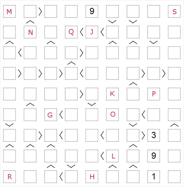 This month's topic is Futoshiki puzzles. These puzzles use a square matrix, typically 4x4 up to 9x9. Each square in the matrix contains a number (1 .. gridsize) ; similar to Sudoku, each number (1 .. gridsize) will appear exactly once in each row and column (i.e., it is a Latin Square). Some puzzles will have a few of the numbers already identified in the matrix. To give hints regarding which numbers belong in each square, the grid shows the less_than (<) or greater_than (>) relationship between some adjacent squares. For example, the square to the left of the square containing 3 must be larger than 3; i.e. it must be between 4 and 9, inclusive.
