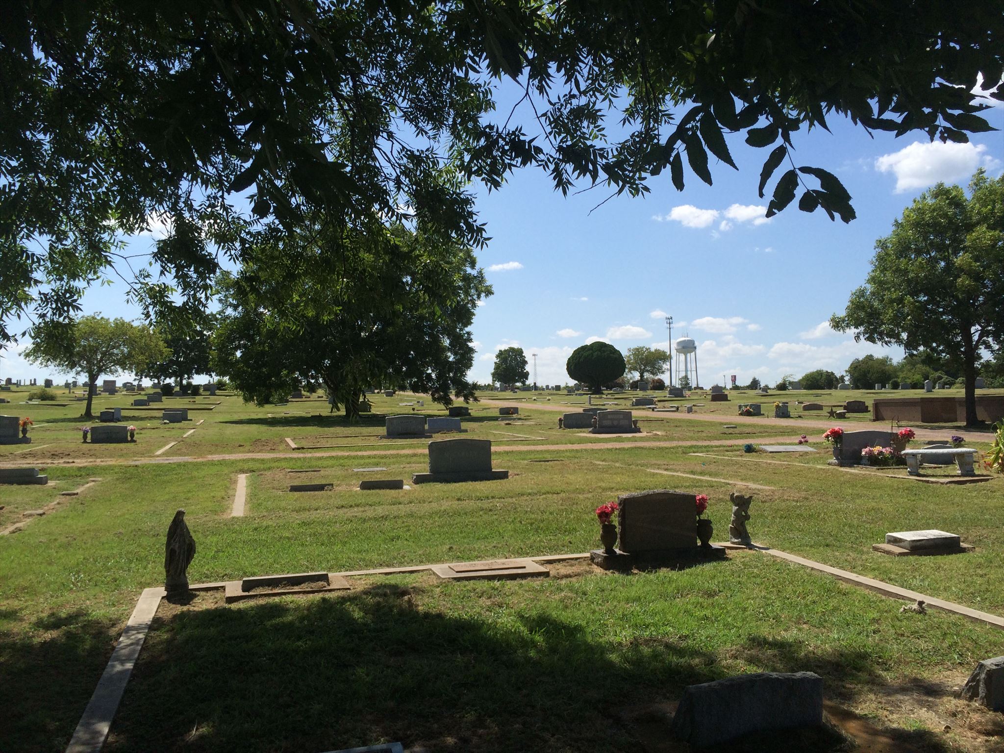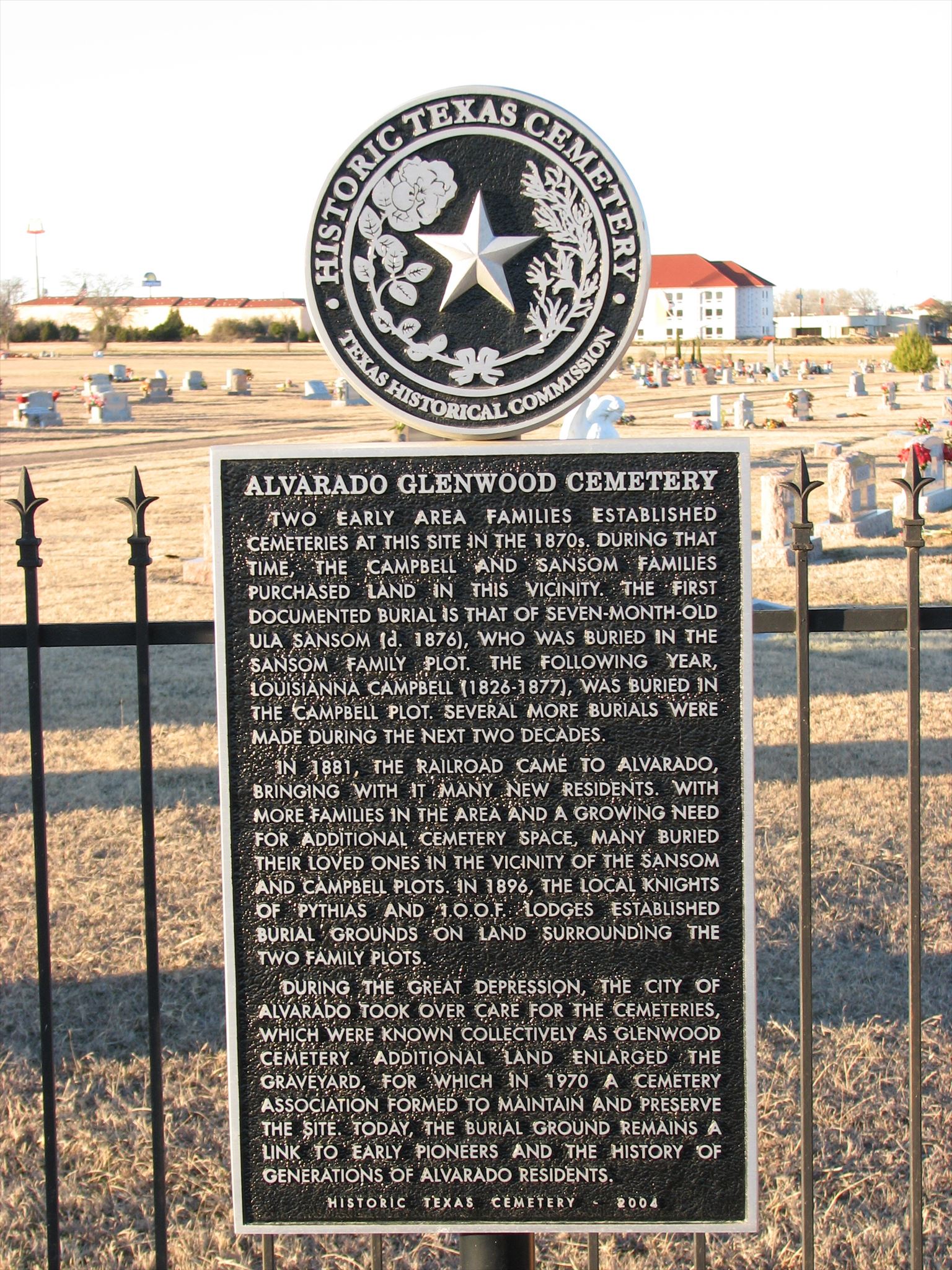 Two early area families established cemeteries at this site in the 1870s. During that time, the Campbell and Sansom families purchased land in this vicinity. The first documented burial is that of seven-month-old Ula Sansom (d. 1876), who was buried in the Sansom family plot. The following year, Louisianna Campbell (1826-1877), was buried in the Campbell plot. Several more burials were made during the next two decades. In 1881, the railroad came to Alvarado, bringing with it many new residents. With more families in the area and a growing need for additional cemetery space, many buried their loved ones in the vicinity of the Sansom and Campbell plots. In 1896, the local Knight of Pythias and I.O.O.F. lodges established burial grounds on land surrounding the two family plots. During the Great Depression, the City of Alvarado took over care for the cemeteries, which were known collectively as Glenwood Cemetery. Additional land enlarged the graveyard, for which in 1970 a cemetery association formed to maintain and preserve the site. Today, the burial ground remains a link to early pioneers and the history of generations of Alvarado residents.