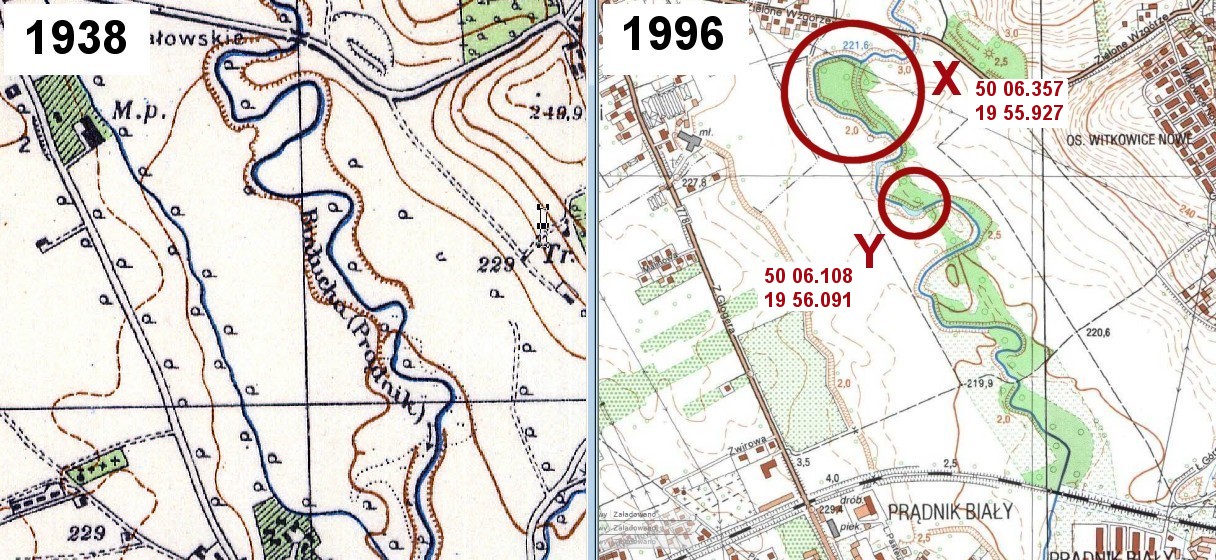 Od 1996 roku koryto uległo dalszemu wymodelowaniu. Jakie różnice względem mapy sprzed niespełna 20 lat zaszły w terenie w punktach oznaczonych jako X i Y?