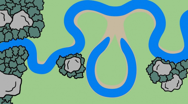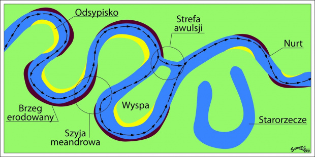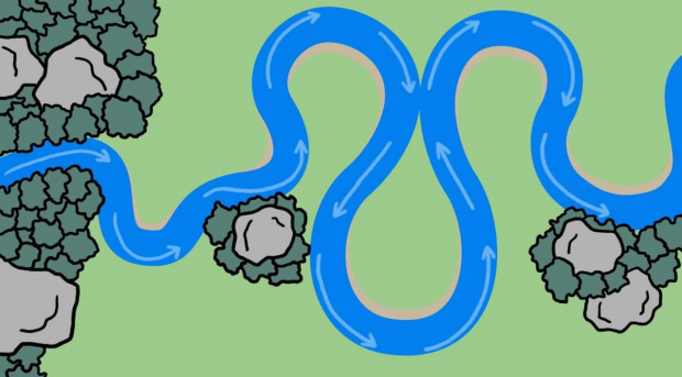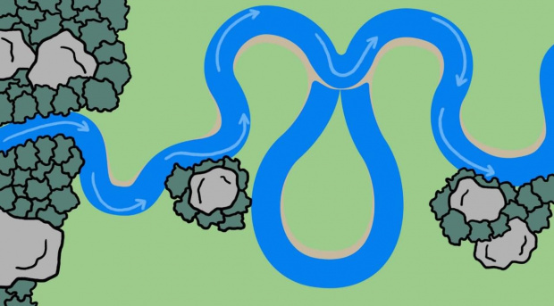 W dużym skrócie rzeka meandrująca to taka która tworzy liczne zakola, łachy (odsypy), a z czasem także starorzecza. Ten EC przedstawia proces powstawania i przyrostu meandrów z punktu widzenia geologii dynamicznej..