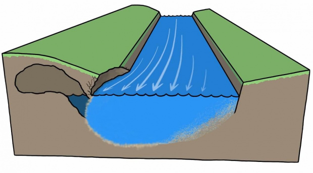 Jednocześnie nurt rzeki niejako „skręca” i zwalnia po przeciwnej stronie. Tam woda nie jest w stanie przenosić mułów i piasków i akumuluje je na dnie, stopniowo wypłacając koryto.