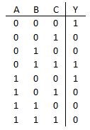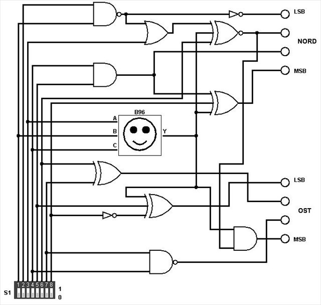 Zentral im Schaltbild findet Ihr ein etwas exotisches Gatter, das sogenannte 'Buben-Gatter', bezeichnet mit B96, was sich merkwürdigerweise nicht durchsetzen konnte. Die Wahrheitstabelle des Buben-Gatters findet Ihr in Tabelle 2.