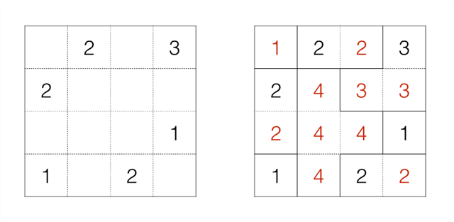 Divide the grid along the dotted lines into regions called polyominoes so that no two polyominoes with the same area share an edge. Inside some cells are numbers; each number must represent the area of the polyomino it belongs to. A polyomino may contain zero, one, or more of the given numbers. (It is possible for a “hidden” polyomino — a polyomino without any of the given numbers — to contain a value that is not present in the starting grid such as a 6 in a puzzle with only 1-5 clues.)
