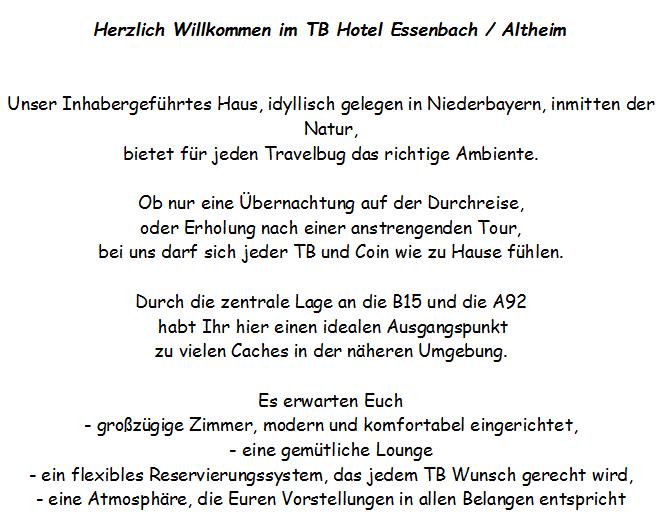 Das ursprüngliche TB Hotel, welches vielen Cachern aus nah und fern Freude bereitet hat, wurde gestohlen und existiert leider nicht mehr.