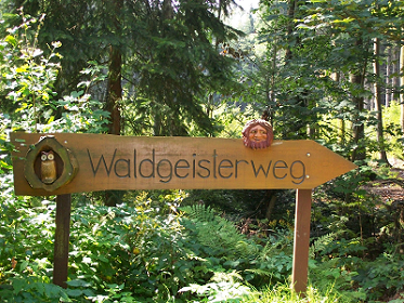 Bald kommst du zu den Fliegenpilzen und dem Schild Waldgeisterweg. Lausche dem zwitschern der Vögel und suche hier (aber nicht direkt am Wegweiser) den zweiten Schatzkartenteil.