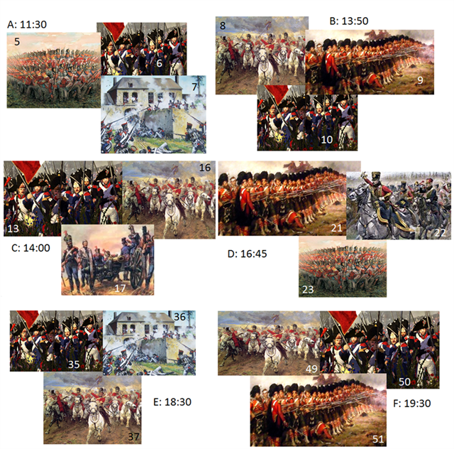 At around 11:00 on 18th June the Battle of Waterloo began when Napoleon launched an infantry attack on the strategically vital château Hougoumont. For eight hours the French battered the compound, but its defenders held fast. Around 13:00 Napoleon advances to attack the centre of Wellington's line. This was initially repulsed through well organised infantry fire, and then chased down with cavalry, capturing two French 'eagles' but losing a third of its men in the process. At 15:00 and for the following two hours, the French cavalry attacked the Allied troops, but the allies, formed into tight squares bristling with guns and bayonets proved unbeatable. Towards evening at around 18:15, La Haye Saint eventually fell to the French as the defenders ran out of ammunition. This was a key stronghold, and it allowed Napoleon the opportunity to send forward his artillery. Meanwhile, the Prussians had fought their way to within reach of Napoleon's headquarters and the scene was set for the final showdown.