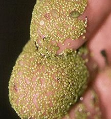 Each Wolffia flower consists of a single pistil and stamen; it also produces the world’s smallest fruit, called a utricle. The plant is found in quiet freshwater lakes or marshes with species worldwide. Since the plants have no roots, they can easily float on the surface of the water, where they resemble cornmeal. Water-meal is sometimes used in cold-water aquaria since it is easy to propagate.