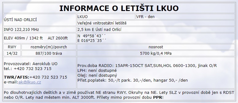 Zde je přehledná tabulka, kde se dozvíte podstatnou většinu důležitých informací o letišti (samozřejmě s vyjímkou pro piloty neméně důležitých mapových podkladů, jako je např. přibližovací mapa nebo podrobný náčrt letiště samotného). Obdobné tabulky s informacemi o všech letištích v ČR najdete např. v publikaci Databáze letišť.