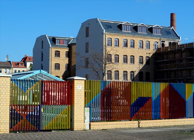 Auf der gegenüberliegenden Straßenseite befindet sich die ehemalige Trikotagenfabrik – eines der wichtigsten Leipziger Industriedenkmäler. Mit seinen fünf Stockwerken ist es eines der höchsten Gebäude seiner Art in Lindenau und Pllagwitz. Die derzeit stattfindenden Instandsetzungs- und Modernisierungs-maßnahmen werden mit insgesamt 350.000 Euro aus dem Programm „Stadtumbau Ost“ gefördert. Die entstehenden Räumlichkeiten sollen vorrangig an kleine und mittlere Unternehmen aus der Kreativwirtschaft und dem Handwerk vermietet werden. Neben dem Erhalt der historischen Substanz, soll damit eine nachhaltige Belebung des Viertels Viertel um die Lützner und Demmeringstraße erreicht werden.