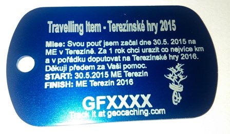 Na eventu si budete moci zakoupit trackables, která jsou speciálně pro tuto akci připravena. Tato trackables si musíte ale ve will attend předem objednat. Na hliníkové známce z hliníku naleznete kromě trackovacího čísla i logo Terezínských her 2015 a popis mise 1.Megaeventového putování trackbales. Cena za jednu známku s řetízkem je 130,-Kč.