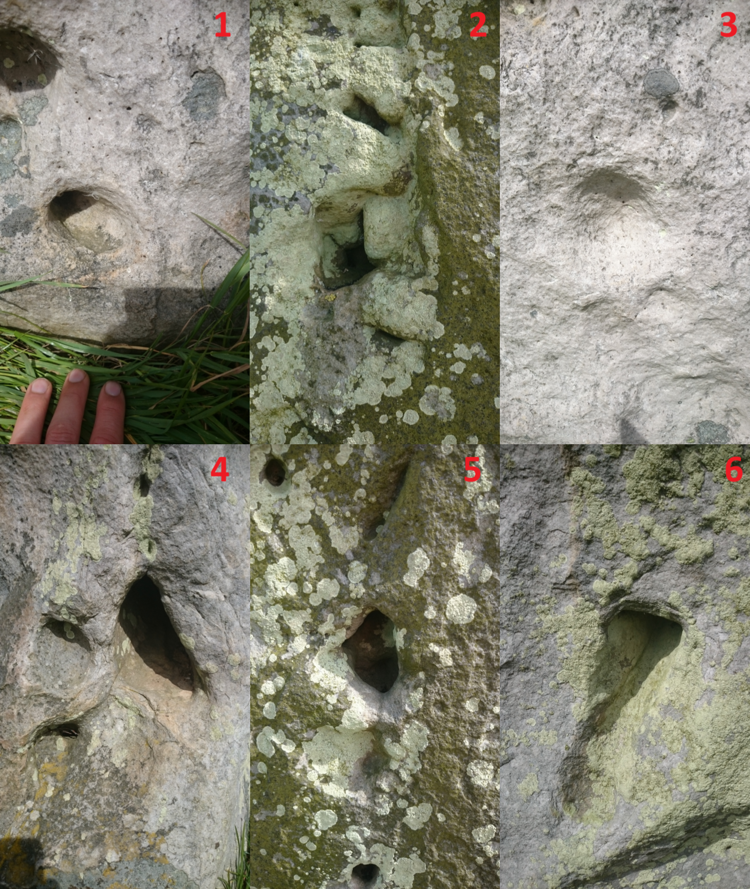 3. La photo numéro 3 est une cupule bien ovale. Expliquez pourquoi elle se trouve dans cette position verticale. Déduisez-en l'ancienne partie supérieure et la partie inférieure de cette pierre.
