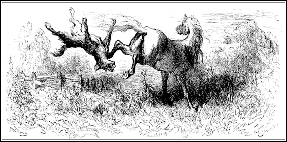 Alors d’une ruade, la mule lui donna un si grand coup de pied, qu’elle lui enfonça le crâne, lui cassa les dents, et se mit à fuir.