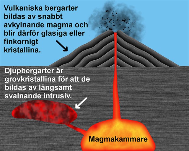 Magmatiska bergarter bildas från smält sten inne i jordskorpan, från vad som brukar kallas magma. När magma svalnar inne i jordskorpan, gör den så långsamt och bildar stenar som har stora, grova korn. De olika mineraler som bildar berget är väl synliga som fläckar av färg i bergarten. När magma lämnar jordskorpan (och då kallas lava), kyls det mycket snabbare vilket gör att stenarna istället bildar fina, små korn av mineraler. Magmatisk sten som bildas under jordytan kallas intrusiva eller plutoniska, medan magmatisk sten som bildas ovanför ytan kallas extrusiva eller vulkaniska.
