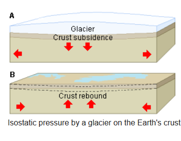 Not just the motion of the glaciers, but also the weight of glacial ice left its mark in Skagway. A river of ice is quite heavy compared to the thinness of the earth’s crust. The weight of these huge glaciers moving through the valley actually bowed (depressed) the crust in Skagway. Typically the crust is bowed beneath an ice sheet about one third of the thickness of the ice sheet. After the glacier melts, the crust returns back up to its original position. This process is called glacial rebound.