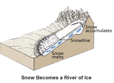 As tectonic plates are acting in depths beneath the surface, the atmosphere is acting on the surface to reform the land. Here in Skagway, erosion and weathering in the form of glaciers break down the mountains that were formed by the smashing plates. Glaciers form at high, cold altitudes where snow collects faster than it can melt. The weight of increasing layers of snow compacts the older layers of snow into ice. Due to gravity, this huge snow and ice mass begins to slide downhill and as this river of ice moves, it carves valleys through mountains.