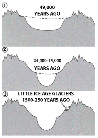 2) A second visible glaciation happened between 24,000 – 13,000 years ago when a glacier came through the first carved U and made a smaller shaped U into the existing valley floor.