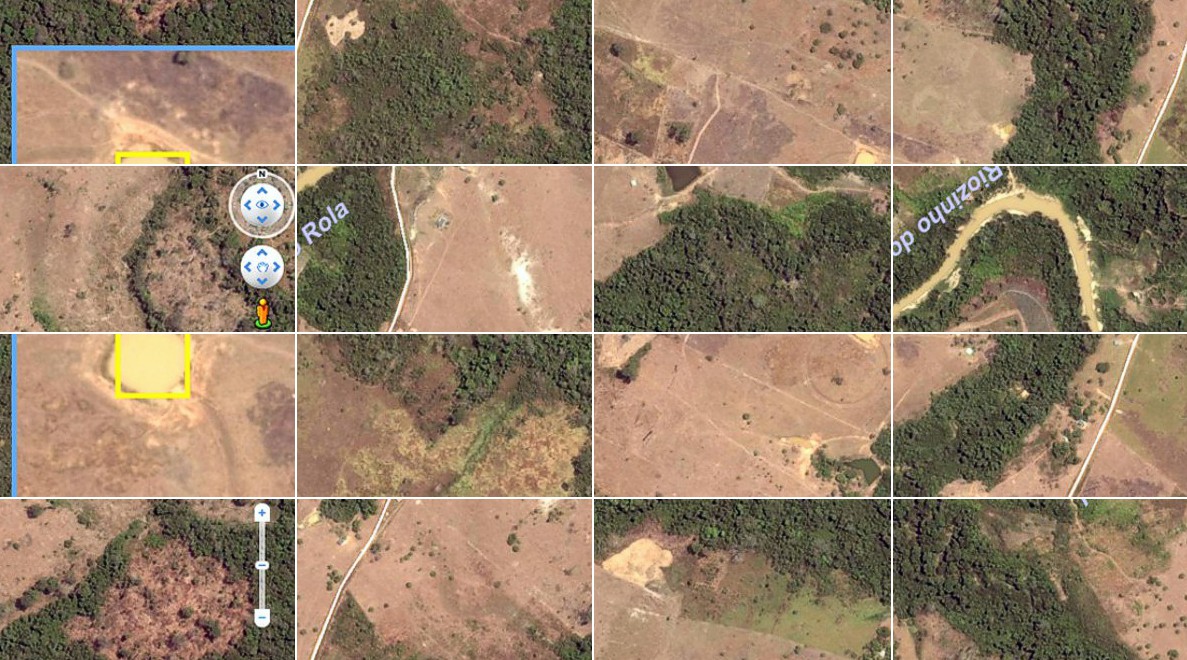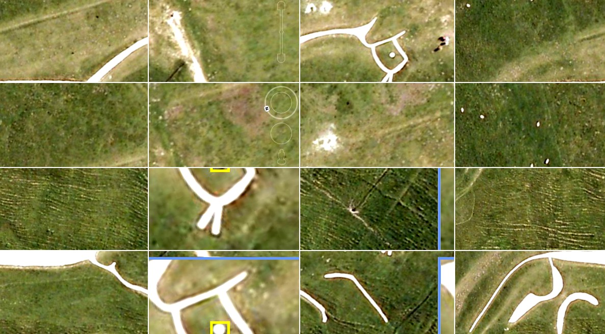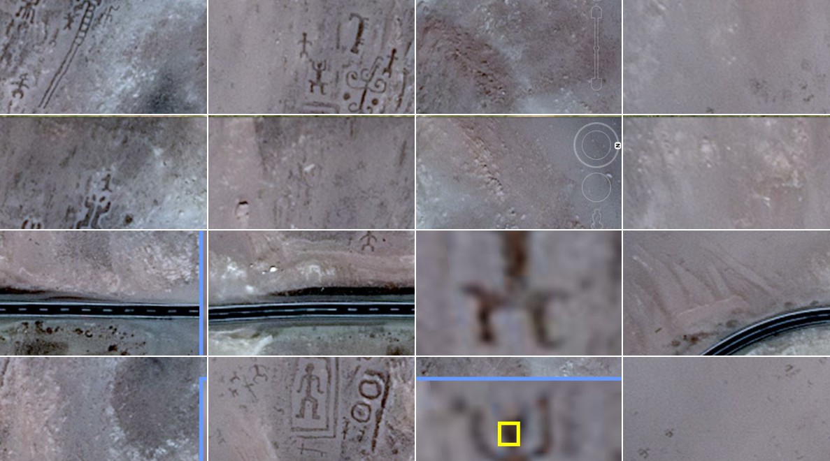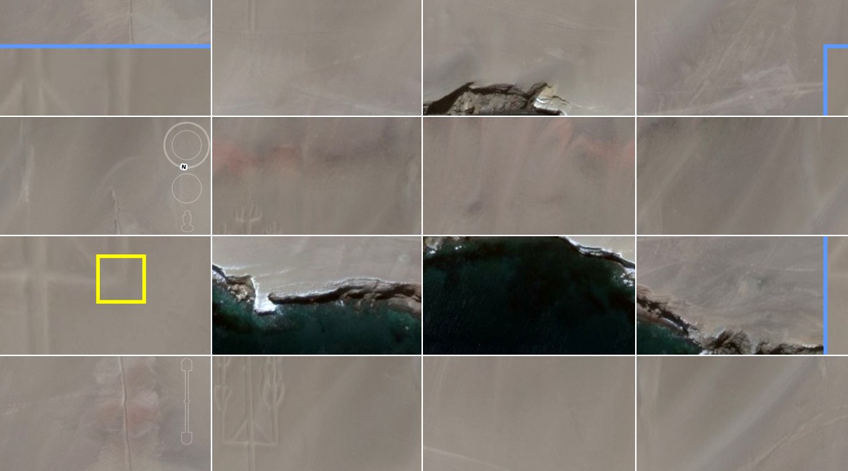 Après avoir résolu les dix puzzles représentant chacun un géoglyphe*, il vous faudra retrouver les coordonnées du détail (carré jaune) qui se trouve dans la zone agrandie (délimitée par la ligne bleue) de chacune des photos d'écran prises à l'aide de Google Earth. Les coordonnées seront à retranscrire dans les cases prévues. Certaines cases comportent déjà les bons chiffres. Les cases comportant une lettre seront utilisées pour le calcul final. Seule la première ligne correspond au premier tableau, les neuf autres sont placées dans un ordre aléatoire.
