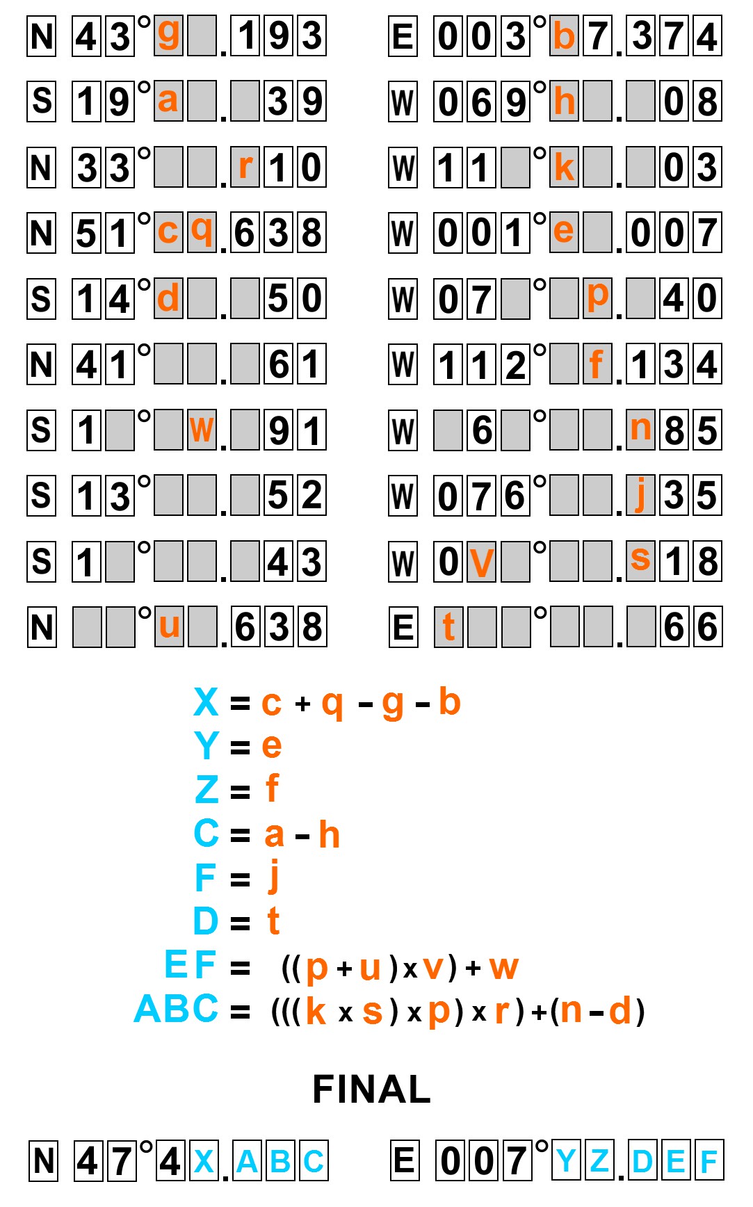 Jedes der zehn bilder ist ein puzzle von einem Geoglyph*. Ist das Puzzle gelöst, müssen sie die Koordinate eines Details finden (gelbes quadrat) das in der mit blauer Linie umgebenen Vergrößerung zu sehen ist (die Bilder stammen aus Google Earth). Die Koordinaten sind in den vorgesehenen Feldern abzuschreiben. Einige Felder haben schon die richtige Zahl. Die Felder mit Buchstaben werden für die endgültige Berechnung benutzt. Allein die erste Linie entspricht dem ersten Bild, die anderen neun Linien sind in zufälliger Reihenfolge geordnet.