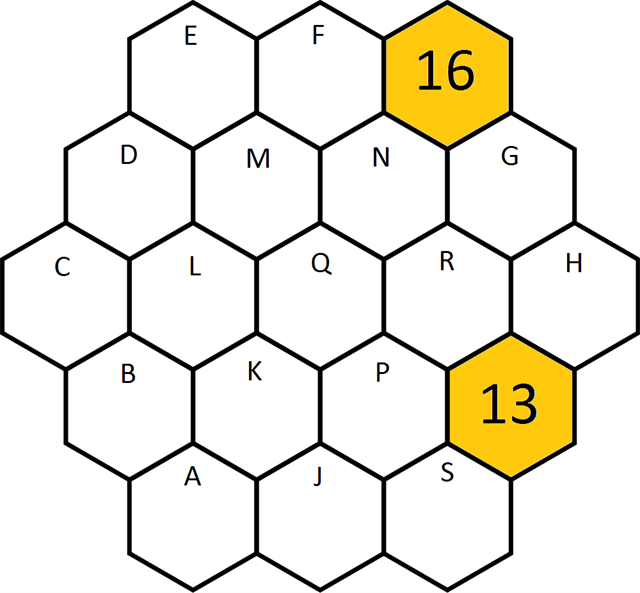 The image below is an arrangement of 19 hexagons with a few numbers filled in. You will need to fill in the remaining hexagons so that all the numbers between 1-19 are used. Additionally, the numbers of each row or diagonal when added must all make the same sum.