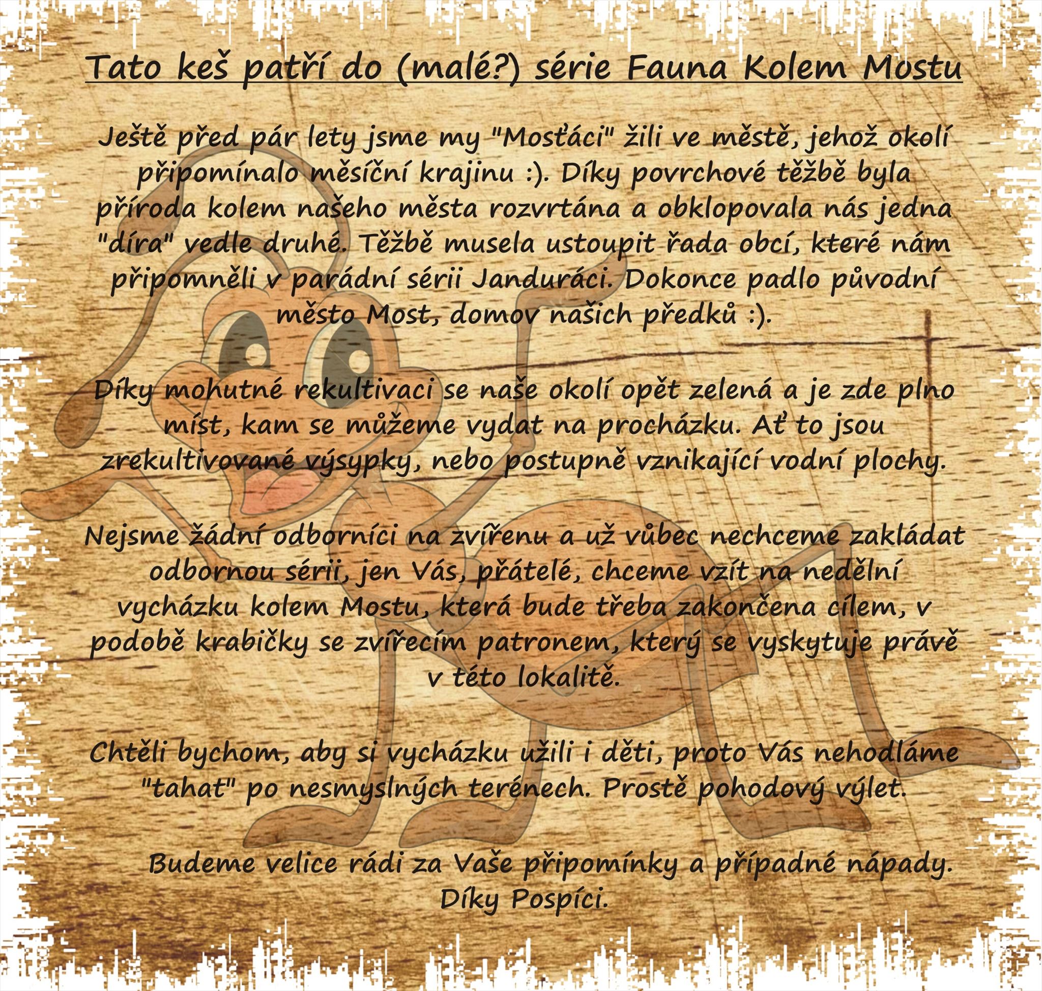 Keš se nachází na Čepirožské výsypce. Výsypka dolu Šmeral u obce Čepirohy bezprostředně navazuje na úbočí Čepirožské výšiny. Rekultivační práce byly zahájeny v roce 1973 uvolněním 59 ha plochy do rekultivace. Projekt řešil kompletně celou plochu s ohledem na okolí lesoparkové rekultivace v okolí města Mostu v rozsahu 34 ha lesní-lesoparkové plochy včetně přístupových komunikací. Výsypka je zpřístupněna systémem parkových cest. Široký sortiment stromů i keřů, včetně okrasných dřevin a zakomponování lesních palouků podtrhuje charakter příměstského lesoparku.