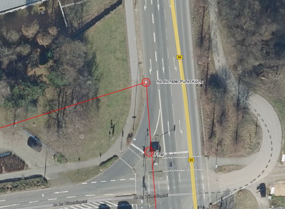 Der Leitpfosten ist mittlerweile leider verschwunden. Erst lag er lange hinter der Kreuzung im Gras, dann war er ganz weg. Aber die Koordinaten, von denen aus du peilen sollst, stimmen immer noch. Man kann die Stelle auch am wechselnden Fahrbahnbelag auf dem Fußweg erkennen. Der nördlichste Punkt Köln befindet sich gerade noch auf der Fahrbahn.