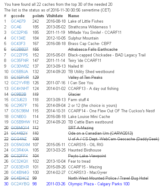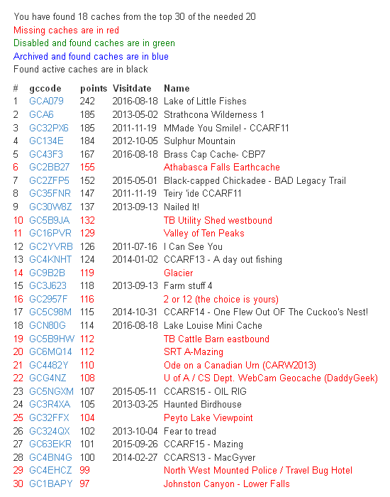 - The top 30 active caches within Alberta with the most favorite points at the time the checker is run.