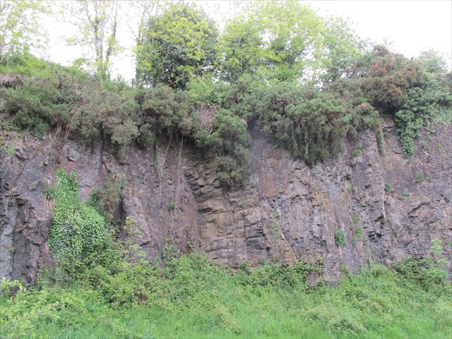The dyke here is made up of a rock called dolerite which is very similar to basalt, making this feature difficult to spot! However being the kind Cache Owner that I am, a photo of the Dyke at Belshaw's Quarry is included below. Notice that the main joints in the dolerite dyke are horizontal whereas the cooling joints in the basalt lavas are generally vertical.