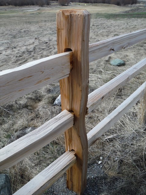 The post and rail fence is a simple construction type of fence. Fence posts can be made out of trees cut down and put in place at the appropriate distance. The rails can be made out of longer trees and then nailed to the posts. In a lot of instances, the materials can come from right on site. This particular fence, however, is a brand new one made in the old fashioned way! The posts and rails are all hand fashioned out of western red cedar and the rails are joined to the posts with mortise and tennon joints. No nails are used in the construction. A safe place to view a close-up the fence is at the location noted.