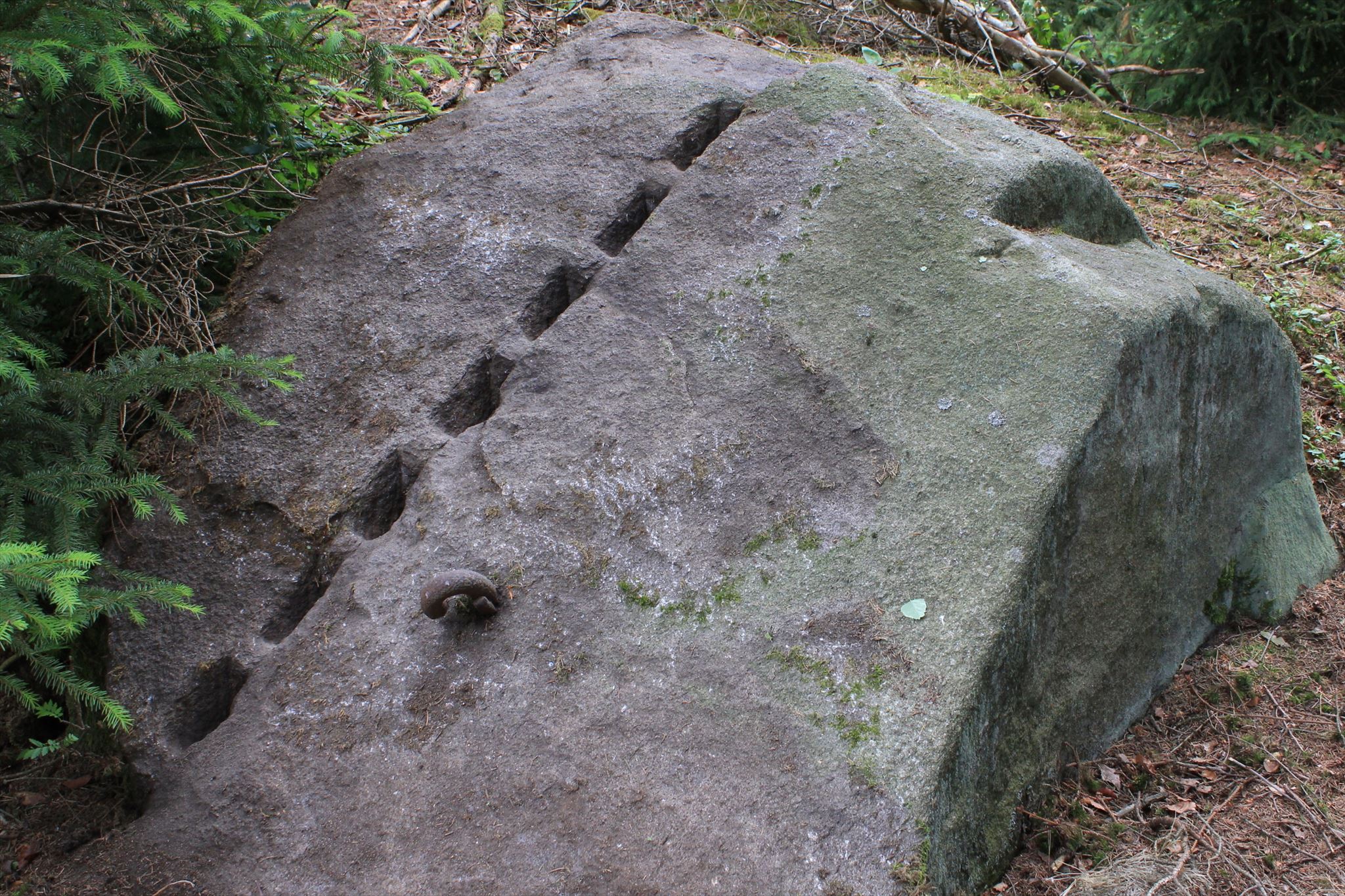 Pokud Vás bude v lese zlobit GPS, přímo u kešky je tento viditelně kamenicky opracovaný kámen s devíti záseky a ocelovým okem.