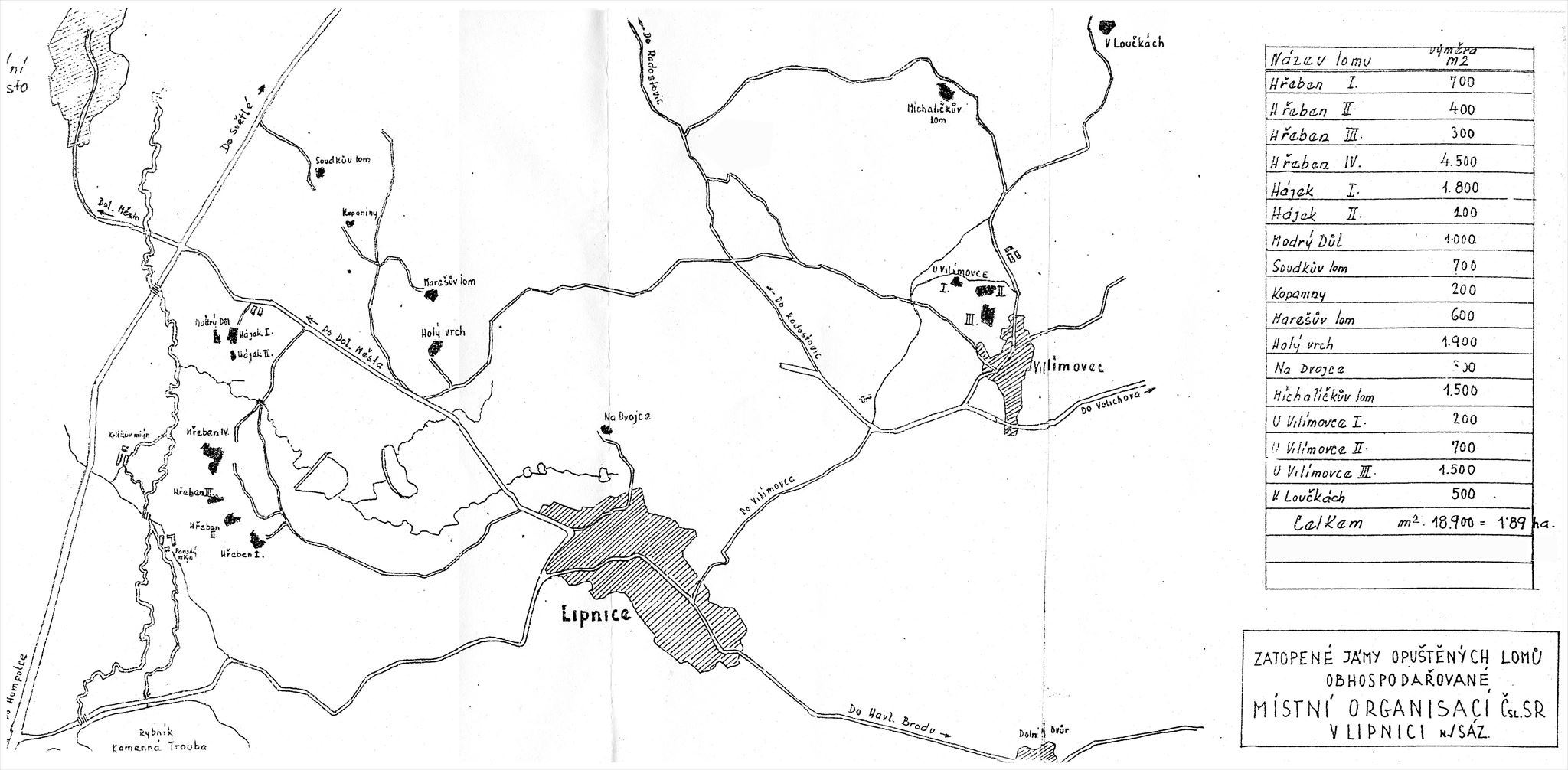 Po ukončení težby byla většina z lomů zatopena podzemní i dešťovou vodou a po mnoho let je obhospodářovával místní rybářský svaz, jak tomu nasvědčuje i dobový ručně dělaný plánek včetně tehdejších výměr vodních ploch. Ryby jsou dnes stále v každém z lomů, na některých se sportovně rybaří.