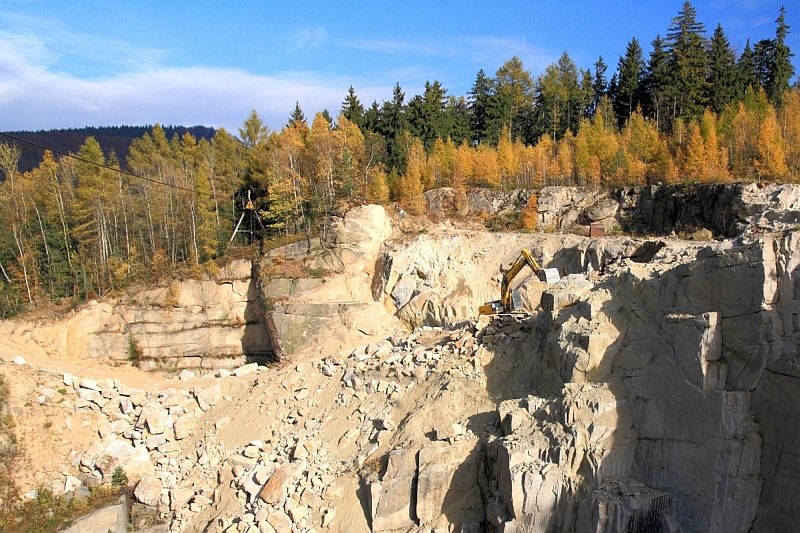 Těžba takového materiálu není zrovna jednoduchá. Povětšinou probíhá tak, že se skála navrtá mnoha vrty vedle sebe v požadované linii, vrty se naplní výbušninou a odpálí. Tím se ze skály vylomí požadovaně velký kus skály, který se povětšinou v blízkosti lomu zpracovává na požadovaný výrobek - desky, kvádry, obruby... V okolí větších lomů také běžně potkáte "navážku" z nepotřebných kamenů...