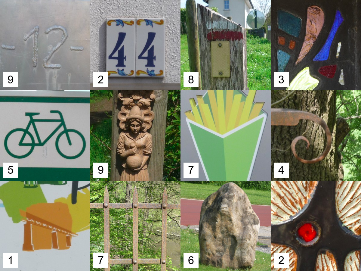 An jeder Station gilt es, ein Bild des Bilderrasters zu identifizieren. Die Ziffer im Bild ist eine Ziffer der Finalkoordinate. Natürlich enthält das Bilderraster mehr Bilder, als Ziffern gesucht werden, sonst wäre es zu einfach.