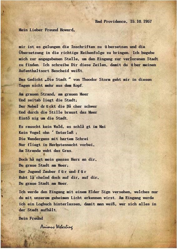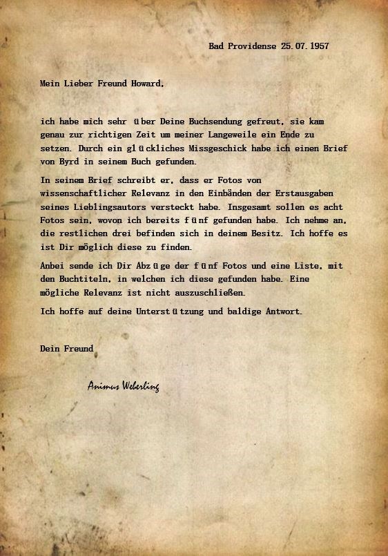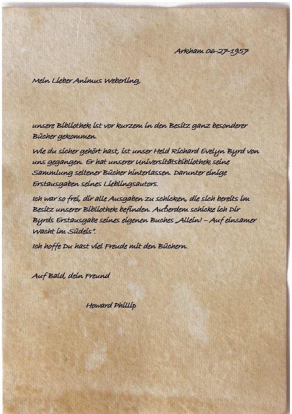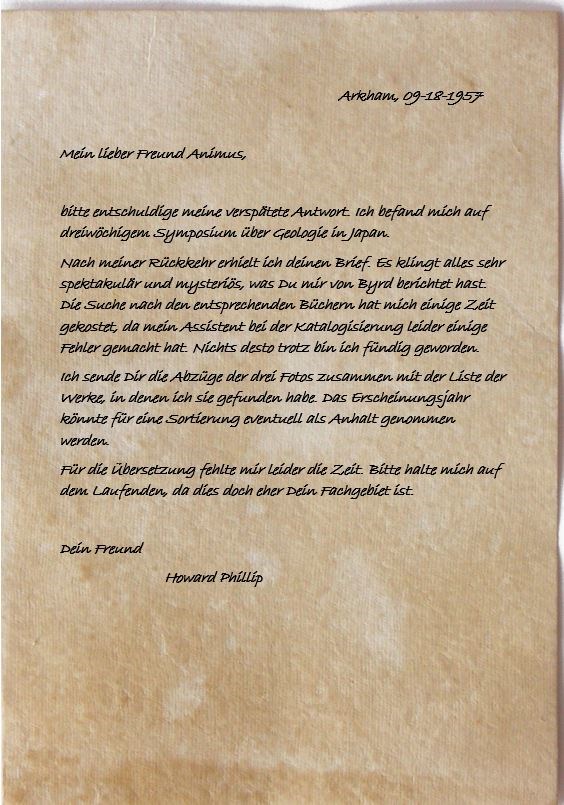 Nachdem Will ging, schloss Animus die Tür hinter ihm ab und öffnet das Paket. Obenauf liegt ein Brief von seinem Freund Howard Phillip. Er arbeitet in der Bibliothek der Miskatonic University in Arkham. Die beiden hatten sich auf einem Symposium über Antarktisexpeditionen kennengelernt und stehen seit dem in regelmäßigem Briefkontakt.