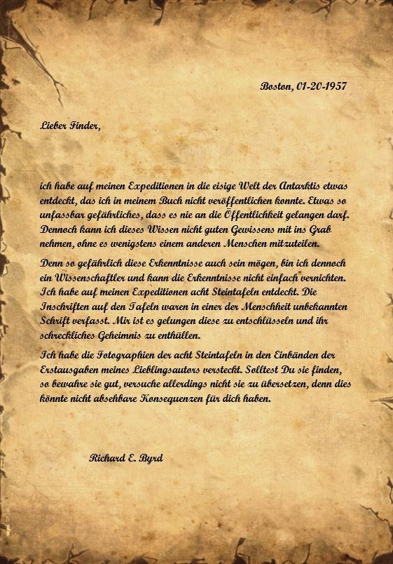 Animus traut seinen Augen kaum. Sollte es tatsächlich war sein, was Byrd schreibt, oder wollte Ihn hier nur jemand an der Nase herumführen? Hin und her gerissen, macht er sich erst einmal einen neuen Tee. Als er sieht wie aus seinem Wasserkessel der Dampf aufsteigt denkt er bei sich „Warum sollte ich es denn nicht versuchen? Ich glaube zwar nicht, dass ich etwas finden werde, aber wenn ich es vorsichtig mit dem Wasserdampf versuche, nehmen die Bücher auch keinen Schaden.“. Gesagt, getan. Animus greift sich das erste in Frage kommende Buch vom Stapel, hält den Einband über den Wasserdampf, löst die erste Seite ab und kann seinen Augen kaum trauen, als ihm tatsächlich ein Foto in die Hände fällt.