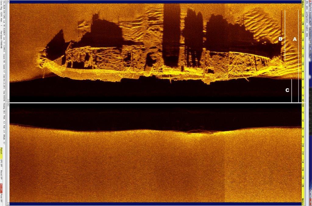 Zdjęcie sonarowe wraku parowca leżącego w okolicach Rowów (z materiałów MIG)