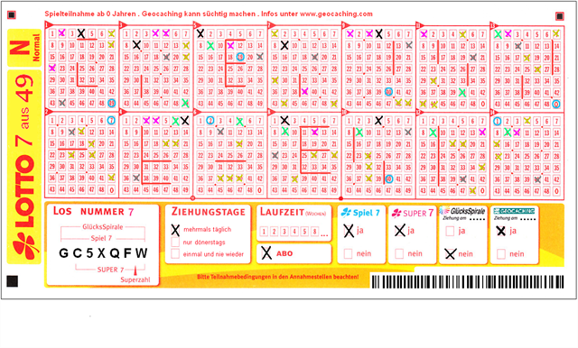 Die Zahlenlotterie LOTTO 6aus49 wurde im Jahr 1955 das erste Mal ausgespielt und ist seitdem die beliebteste Lotterie der Deutschen. Beliebt unter Geocachern ist die Variante 7aus49 aus dem Jahre 2015.