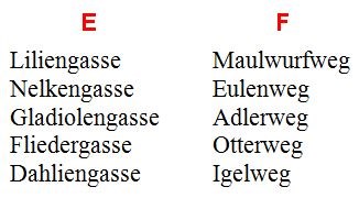Rund um den Ortskern sind in den letzten Jahrzehnten viele neue Siedlungen entstanden, somit mussten für die neuen Straßen, Gassen und Wege auch Namen gefunden werden. Suche nun bei den „blumigen“ Straßennamen den heraus, den es in Wartberg nicht gibt und verfahre mit den „tierischen“ Straßennamen ebenso. Nimm diese Blume in der Einzahl für E und das Tier für F. Bilde jeweils die Buchstabensumme.