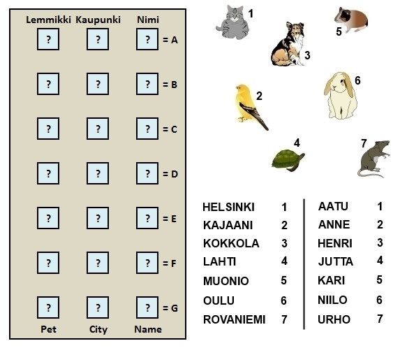 FI: Vasta rakennettuun seitsemänkerroksiseen taloon on muuttanut seitsemän asukasta. Jokaisessa kerroksessa on yksi asunto ja jokaisessa asunnossa asuu yksi asukas yhden lemmikkieläimen kanssa. Lisäksi jokainen asukas on muuttanut eri kaupungista. Selvitä, missä kerroksessa kukin asuu, mistä kukin on muuttanut ja mikä lemmikki kullakin on.