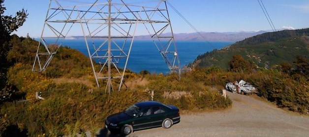 Here there used to be a crushed car (see photo) and the dichotomy between that overpowered vehicle and the power overhead lead to the cache title. Alas, the car has since been removed. The overhead power is the 350,000 volt DC direct connection between Benmore, near Timaru, in the South Island and Haywards, near Upper Hutt, in the North Island.