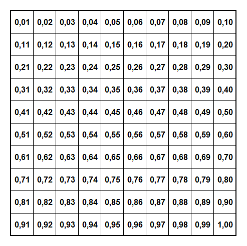 FI: Ruudut on numeroitu 0,01-1,00 vasemmalta oikealle näin. Laske näillä numeroilla jokaisen laivan ruutujen summa.