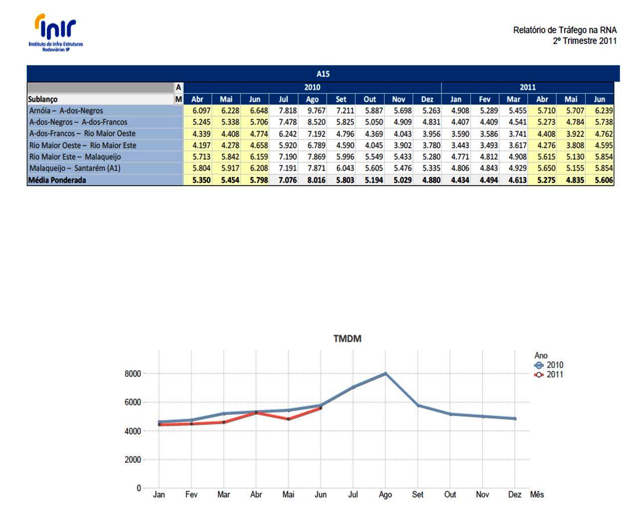 O quadro seguinte representa a Taxa Média Diária Mensal da A15 nos anos de 2010 e 2011.